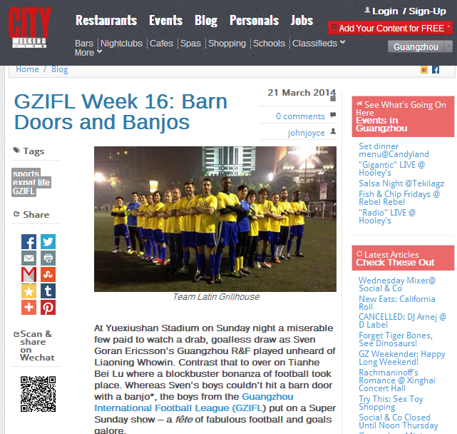 成立之后,拉丁足球队代表拉丁餐厅, 报名参加广州社区酒吧足球联盟赛(注:此次联赛的参赛队伍皆为广州地区的著名酒吧、著名西餐厅所冠名的各大球队)。从2013年6月参赛至2014年4月决赛,拉丁足球队历时10个月,一路过关斩将, 他们的体育精神以及辉煌战绩,被许多外文著名杂志、网站争相报道。