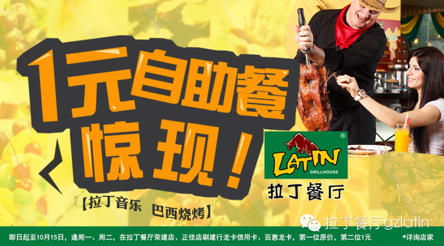 Ladies and 乡亲们,男的们女的们,老的们少的们久等啦!拉丁餐厅联手建设银行龙卡信用卡推出“1元自助餐”啦!