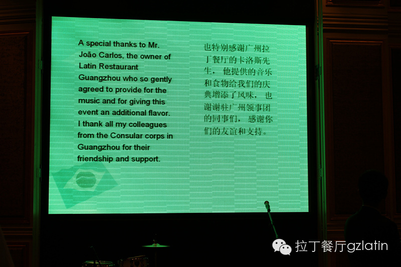 出席本次活动的领导有:巴西联邦共和国驻广州总领事馆总领事约瑟莱萨(Mr.Lessa)先生、广东省副省长招玉芳女士以及中巴各界人士,同时拉丁餐厅董事长吴春清先生、拉丁餐厅营运总监卡洛斯先生也受邀参加了此次活动。活动中,巴西总领事约瑟莱萨先生与广东副省长招玉芳女士分别发表了讲话。