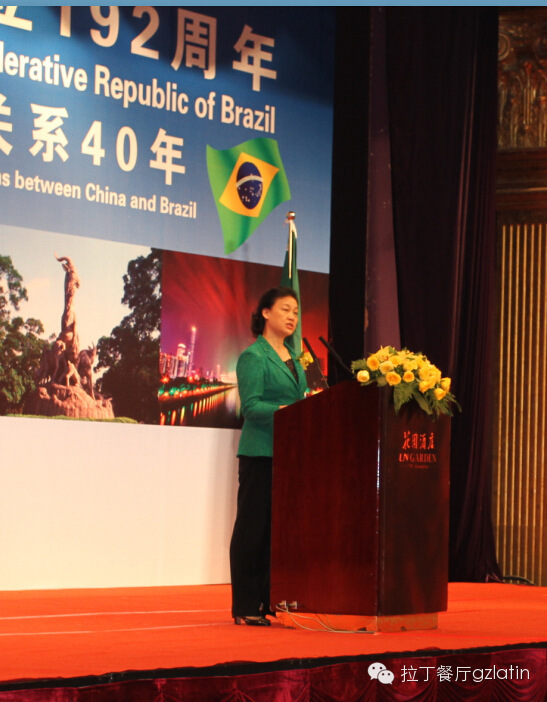 (广东省副省长招玉芳女士发表讲话,对中国与巴西外交关系做了简要说明,表达了对巴西的祝愿,同时也为中秋节送上祝福)